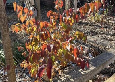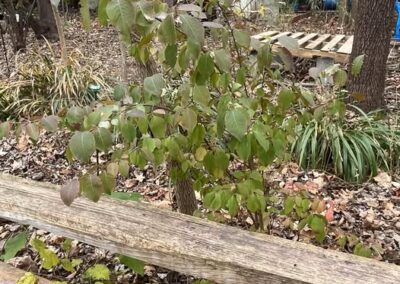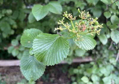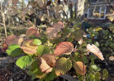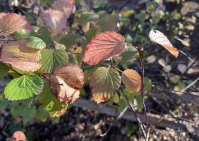 One of the challenges of restoring forest is attracting native volunteer shrubs. The only volunteer shrub we have is dogwood. We have planted native shrubs because we value the intermediate layer of canopy they provide, in-between the tree canopy and herbaceous plants. They are key to human enjoyment of the wildlife views in a home habitat, because shrubs are closer to human eye level. Birds nesting and foraging there are easier to watch. They provide cover for wildlife at the ground level, and serve as living fences which provide ecological service by trapping and holding plant litter in the garden.